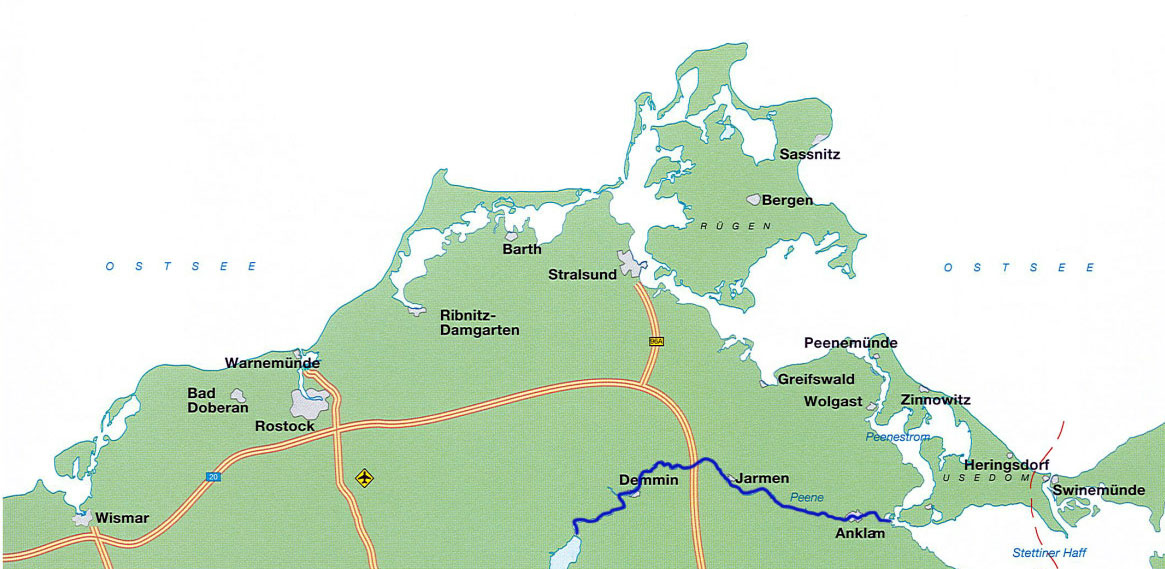 Die rund 100 km lange Peene gilt noch immer als „Geheimtipp“ unter den Wassersportrevieren, frei von Schleusen und Wehren. Kleine verträumte Häfen oder das freie Ankern auf dem Fluss laden zum Übernachten ein. Unterwegs begegnen Ihnen seltene Tiere und Pflanzen wie u.a. Seeadler, Eisvogel, Biber, Pfleilkraut und Blutweiderich so häufig, wie nirgendwo sonst in Westeuropa. Sehenswürdigkeiten auf Ihrer Fahrt: