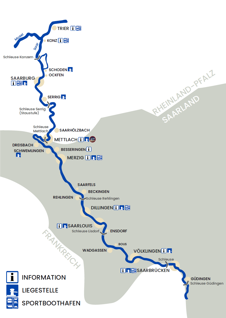 Strecke: Mettlach – Saarbrücken – Mettlach (120 km - 8 Schleusen - 15h)
