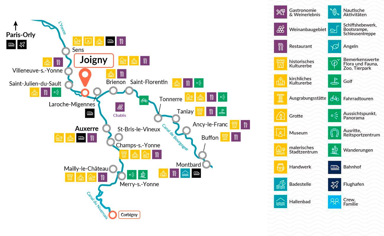 Joigny ist ein idealer Ausgangspunkt für Hausbootferien im Burgund. Es liegt direkt am Kreuzpunkt von drei berühmten Wasserwegen: dem Burgund-Kanal, der Yonne und dem Nivernais-Kanal. Joigny bietet somit die perfekte Ausgangslage mit zahlreichen Routen. Von der Basis in Joigny erhalten Sie die Möglichkeit, die zahlreichen Sehenswürdigkeiten im Burgund zu besuchen. Sie erhalten einen Einblick in die Geschichte Frankreichs und können dabei die schöne Natur des Burgunds geniessen. Während Sie auf dem Wasser dahingleiten, reihen sich an beiden Ufern kleine Dörfer und Städte, die zu einem Besuch einladen. Zudem haben Sie die Möglichkeit, die burgundische Gastronomie und ihre bekannten Weine zu geniessen.