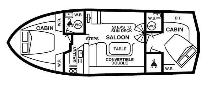 - 2 geräumige Doppelbett-Kabinen (im Bug und im Heck)