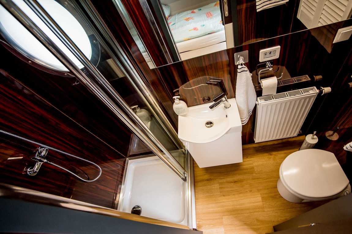 Die im Bungalow-Stil erbauten Boote der Komfortklasse 9 bestechen vor allem durch den zusätzlichen Platz, der mit dem begehbaren Oberdeck geschaffen wird. Hier können Sie sonnige Stunden in den Liegestühlen verbringen. Der untere Bereich ist aufgeteilt in einen Wohn- und Essbereich sowie in einen Schlafbereich mit Bad/Dusche. Die grosse Bugterrasse bietet eine gemütliche Lounge-Ecke für gesellige Stunden. Die Schlafkabine besteht aus einem Doppelbett (1.20m x 2.00m) und einem Hochbett (0,70m x 2,00m) direkt darüber - ein optimaler Schlafplatz für Kinder. Das Sofa im Wohnbereich kann bei Bedarf zu einem Doppelbett umgebaut werden.