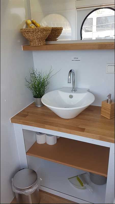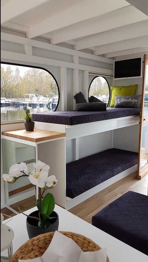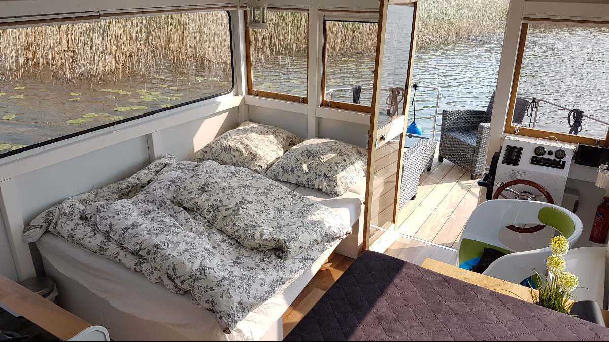 Die Hausboote der Kompaktklasse von "Die Bootschaft" ist ideal für 2 Personen, bietet aber Schlafplätze für bis 4 Personen (2 Etagenbetten und eine Sitzecke, umbaubar in ein Doppelbett). Das Boot ist im Bungalowstil und ähnelt einem Floss mit Haus. Deshalb sind alle Räume sehr hoch und die vielen Fenster bringen viel Licht in das Boot. Die gemütliche Inneneinrichtung besticht durch natürliche Farben und Formen. Es ist genug Platz zum Kochen, Essen und Faulenzen im gemütlichen Wohn- und Essbereich da. Die Küchenecke ist mit 2-flammigem Gasherd, Edelstahlspühle und Kühlschrank ausgestattet. Küche sowie Schlafecke und Wohnbereich befinden sich alle im selben Raum und es gibt viel Stauraum. Die Toilette ist via Heckterrasse begehbar, es steht eine Aussendusche zur Verfügung. Eine grosse Bugterrasse mit gemütlicher Loung-Ecke ladet zum Verweilen im Freien ein.Ideal für ein Paar oder für eine Familie mit kleinen Kindern.