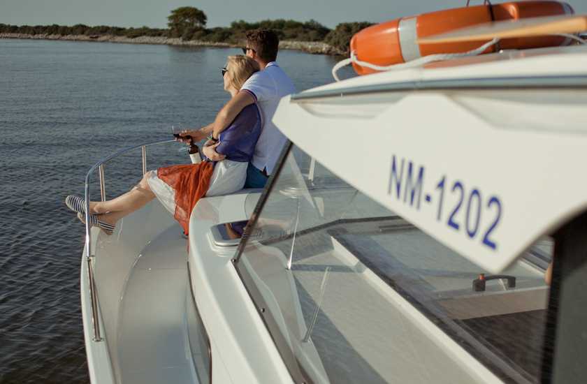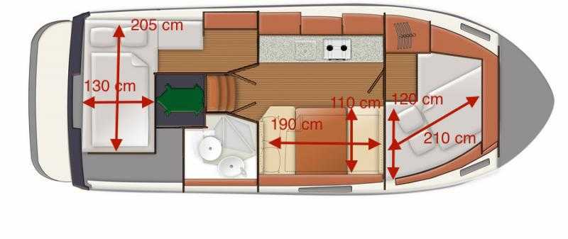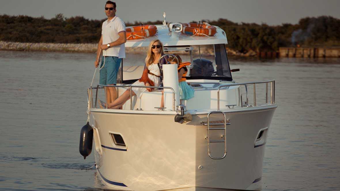 Dank dem modernen Design und der cleveren Raumaufteilung erlebt man dieses Boot geräumiger als viele grössere Boote. Zwei Kabinen je mit Doppelbetten sowie ein geräumiger Aufenthaltsraum mit Küche und Essecke, welche zu einem Doppelbett umgebaut werden kann. Der zweite Aussen-Steuerstand macht das Navigieren bei schönem Wetter zu einer wahren Freude.