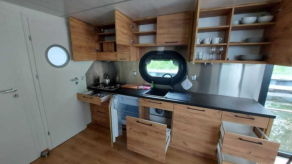 - Küche mit 3-Platten-Gasherd, Backofen, Kühlschrank: 85 l, komplett ausgerüstet für 10 Personen.