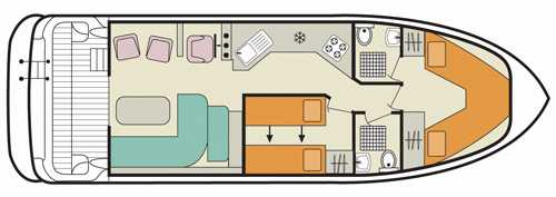 Die beiden Kabinen befinden sich im vorderen Teil des Schiffes und lassen daher viel Platz für den Salon und Steuerstand. Sowohl die Einzelbetten in der Bugkabine wie auch in der Seitenkabine lassen sich je zu einem Doppelbett zusammenfügen. Beide Kabinen besitzen je ein eigenes Bad mit Lavabo, Dusche und elektrischem WC. Auch die Sitzecke im Salon lässt sich zu einem Doppelbett umbauen.