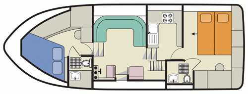 - Heckkabine mit zwei Einzelbetten (umbaubar in Doppelbett) und kabineneigener Nasszelle mit Lavabo, WC und Dusche.