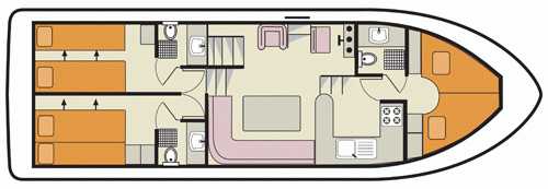 - 2 Heck-Kabinen mit jeweils 2 Einzelbetten (umbaubar zu je einem Doppelbett) und kabineneigener Nasszelle mit Dusche, Lavabo und elektrischem WC.