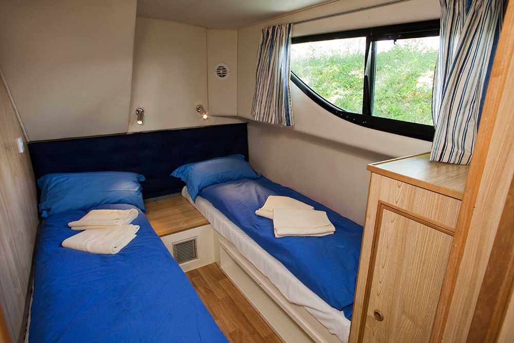 - 2 Kabinen hinten, je mit 2 Einzelbetten, umwandelbar in ein Doppelbett mit je kabineneigener Nasszelle