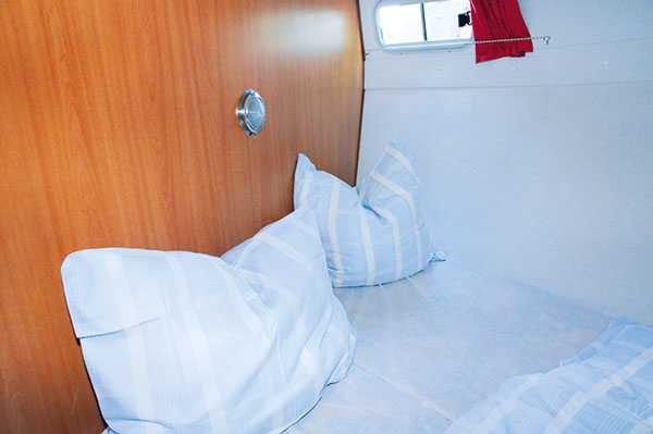 - Bugkabine mit schmalem Doppelbett und 1 Einzelbett