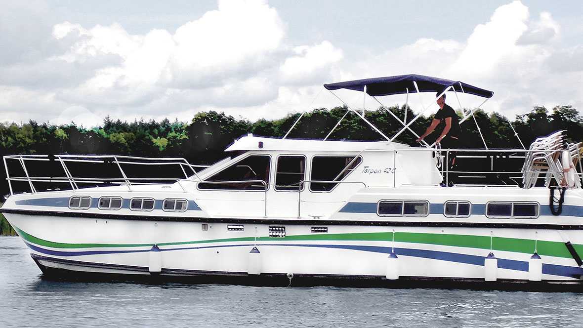 Die Tarpon 42 ist trotz ihrer Grösse dank dem zweiten Steuerstand aussen und dem Bugstrahlruder leicht zu steuern. Die 4 Kabinen verfügen jeweils über ein eigenes Waschbecken. Mit 10 fixen Kojen und dem umbaubaren Doppelbett im Salon haben bis 12 Personen auf dem Boot Platz.
