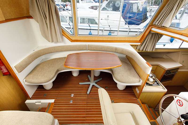 Ausstattung- Geräumiger Salon mit Tisch, Sitzecke und Steuerstand
