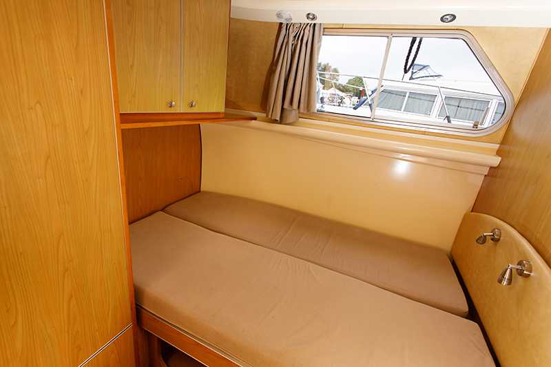 - Bug-Kabine mit einem Doppelbett (zwei Einzelbetten möglich) mit Kleiderablage und Stauraum. Ein zusätzliches Einzelbett kann eingehängt werden.
