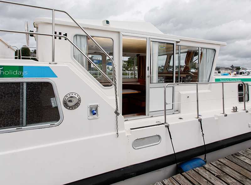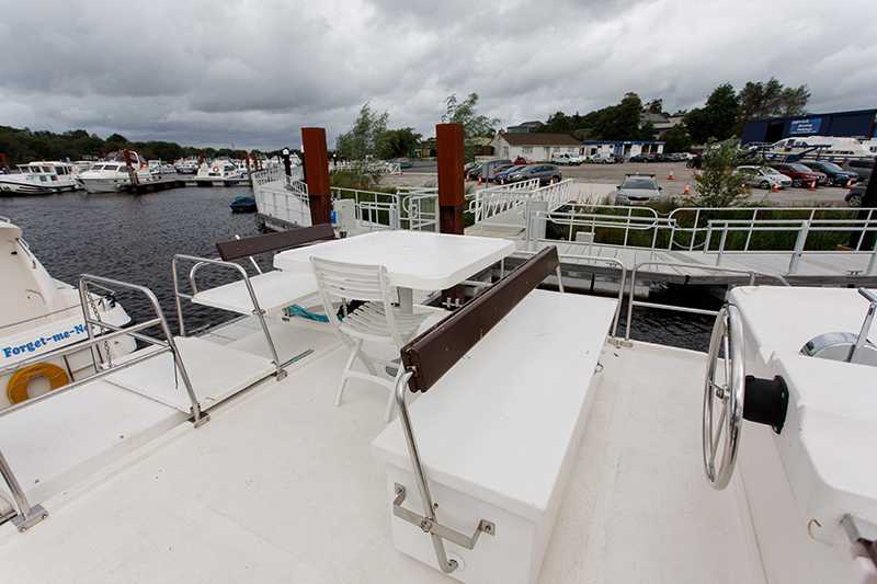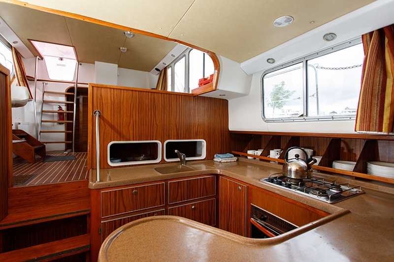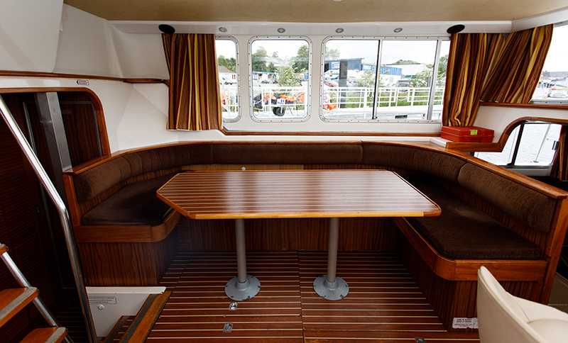 Die Sonnenterrasse mit eingebautem Sitzbank und Tisch sowie der zweite Aussensteuerstand zeichnen die Pénichette 1400FB aus. Die Kabinen befinden sich im Bug und im Heck und lassen viel Platz für einen grosszügigen Aufenthaltsraum in der Mitte des Bootes.