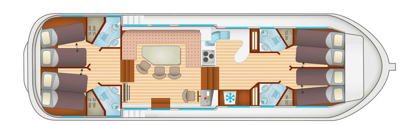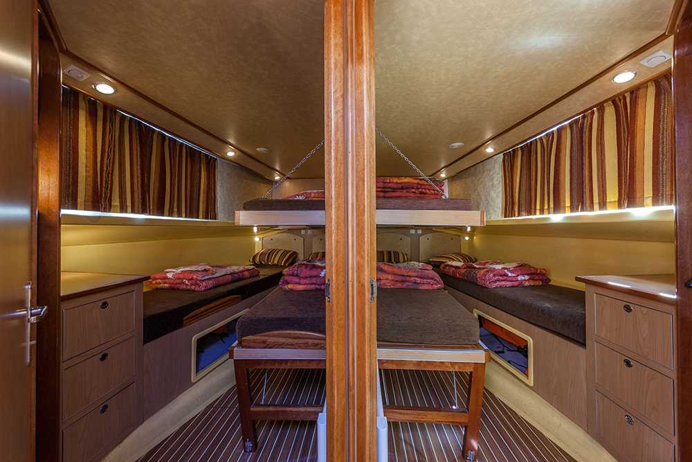 - 4 Kabinen, je mit zwei Einzelbetten, umwandelbar in ein Doppelbett. Auf Anfrage kann in jeder Kabine ein zusätzliches Etagenbett installiert werden