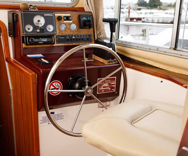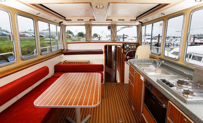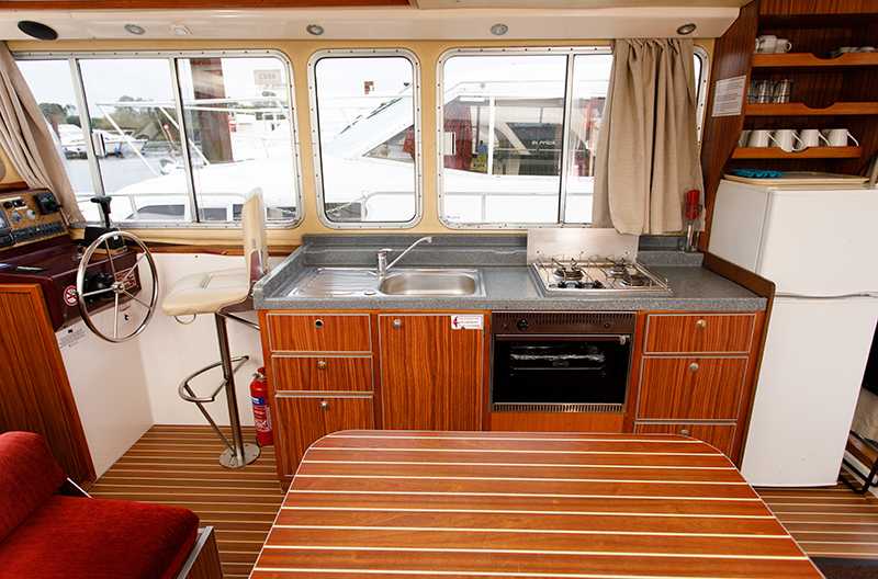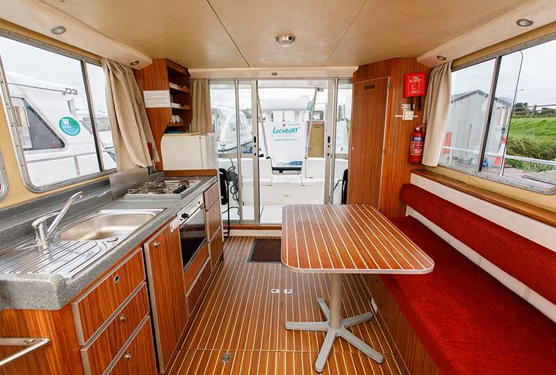 Charakteristisch für die Pénichette 1260R der "Pénichette Terrasse" - Reihe ist der ebenerdigen Ausgang zur überdeckten Heckterrasse. Jede der vier Kabinen verfügt über ein eigenes Waschbecken. Die beiden elektrischen WCs sind getrennt von der Nasszelle. Trotz der Grösse des Bootes ist das Navigieren einfach dank dem erhöhten Steuerstand sowie dem Bugstrahlruder.