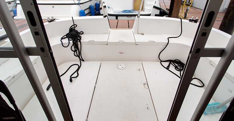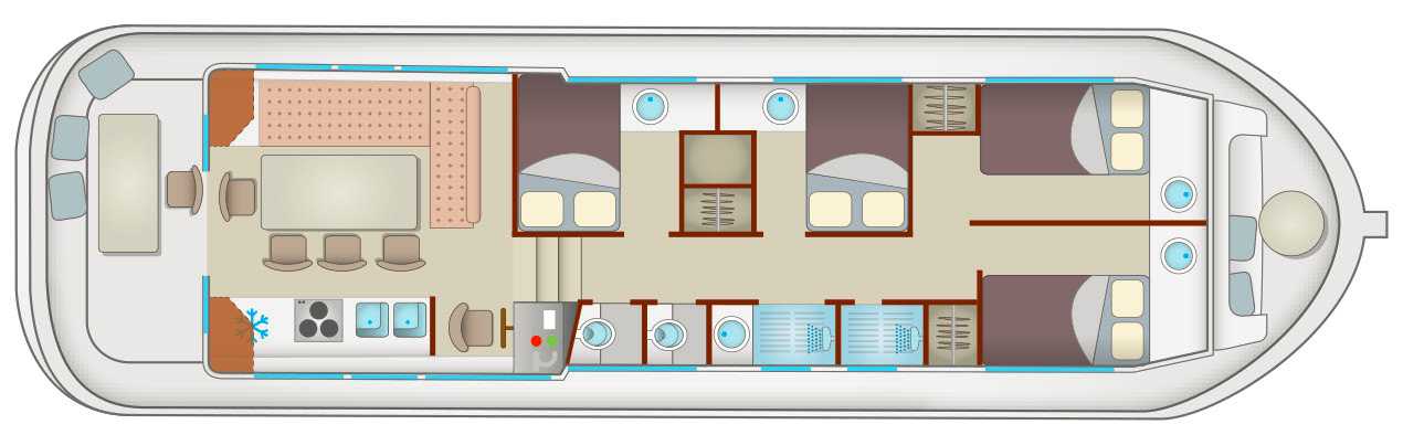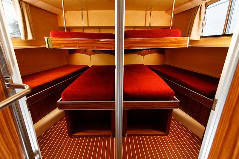 - 2 Kabinen im Bug, je mit Doppelbett, Stauraum und kabineneigenem Waschbecken. Auf Anfrage kann zusätzlich je ein Etagenbett in den vorderen Kabinen installiert werden