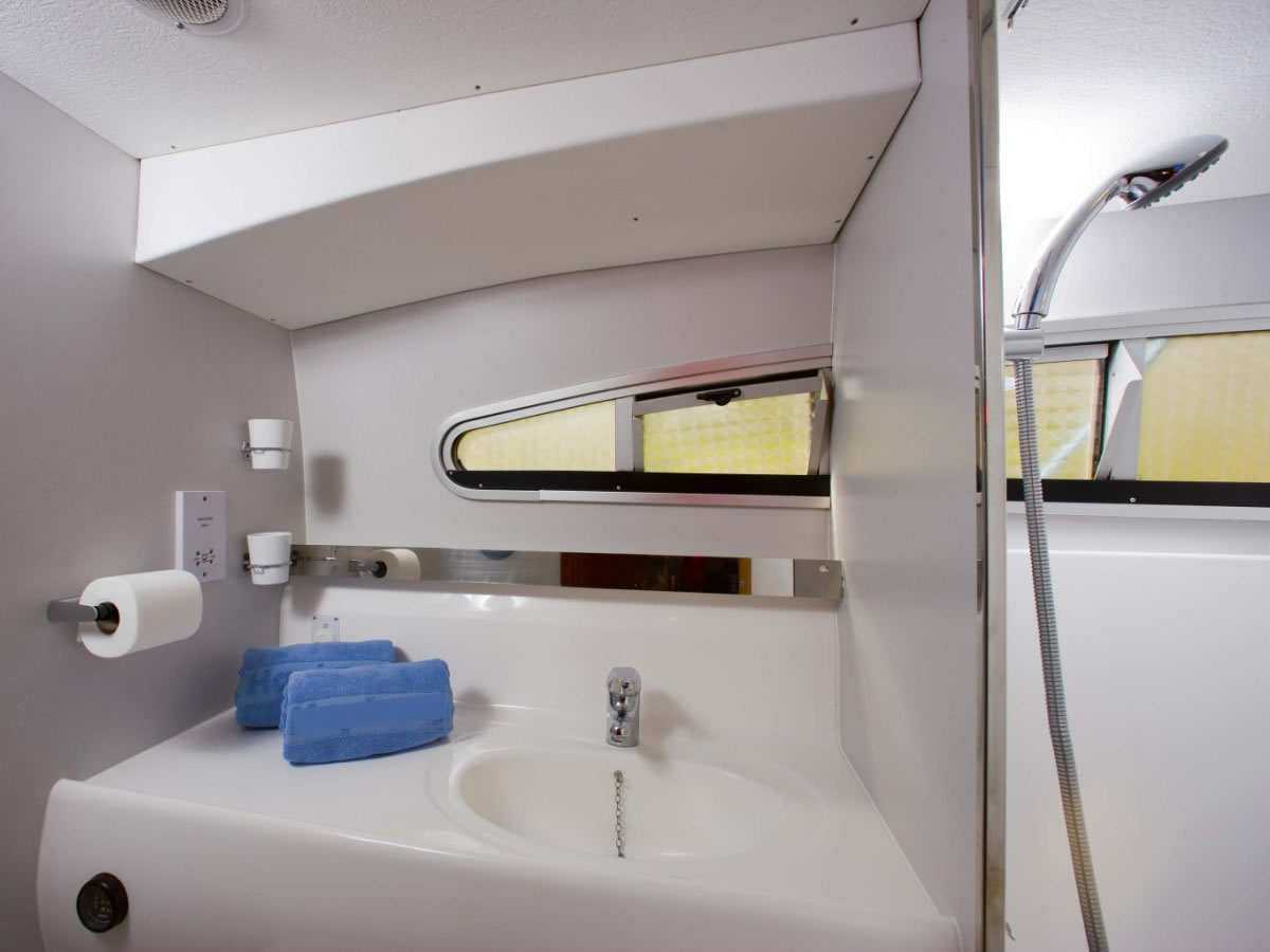 - Heckkabine mit 2 Einzelbetten (2.00x0.75m), umbaubar zu einem Doppelbett, direkter Zugang zu Nasszelle mit Waschbecken, WC und separater Dusche