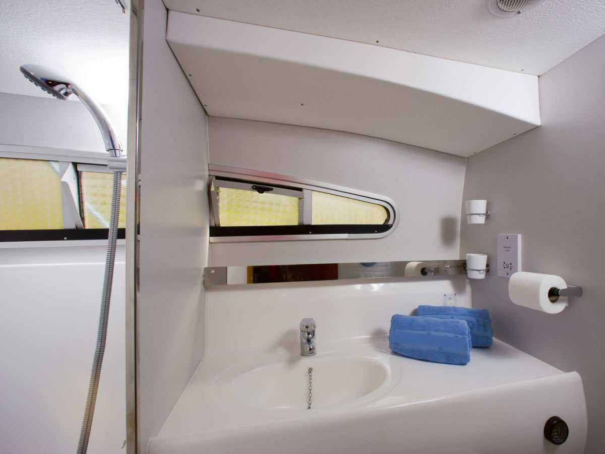 - Heckkabine mit 2 Einzelbetten (2.00x0.8m), umbaubar zu einem Doppelbett, direkter Zugang zu Nasszelle mit Waschbecken, WC und separater Dusche