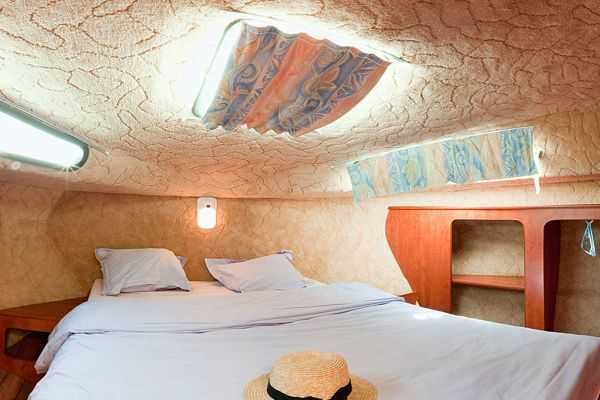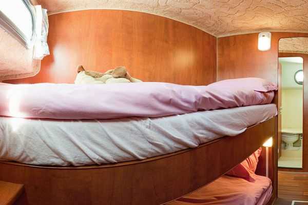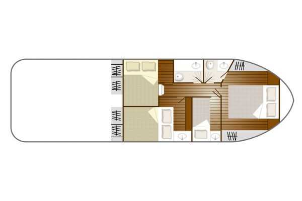 Das Boot verfügt über eine grosszügige Doppelkabine im Bug sowie zwei kleinere Seitenkabinen mit Doppelbetten. Die Doppelbetten in den Seitenkabinen sind in einer Nische untergebracht, so dass über den Schlafstellen eine geringere Raumhöhe resultiert. Diese so genannten "Schlupfkabinen" sind für Erwachsene mit Platzangst nicht empfehlenswert aber bei Kindern meist sehr beliebt. Des weiteren gibt es eine Seitenkabine mit Etagenbett. Das Boot verfügt über zwei Nasszellen mit Waschbecken, Dusche und Toilette. Die Küche ist sehr hell und gut ausgestattet. Vom geräumigen Salon mit Panoramablick erreichen Sie ebenerdig durch die grosse Glasschiebetür die schöne hintere Terrasse mit Gartenmöbeln, Sonnensegel und Badeleiter. Das Boot hat ausserdem einen zweiten Steuerstand aussen auf dem Dach.