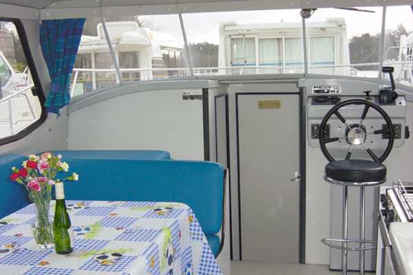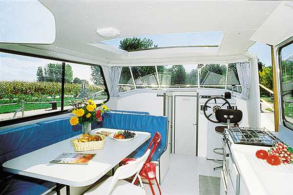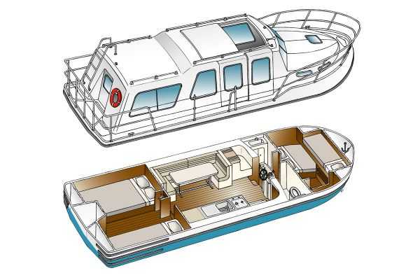 Es ist ideal für zwei Paare oder eine Familie. Die zwei Kabinen sind durch den Aufenthaltsraum in der Mitte getrennt und bieten somit größtmögliche Privatsphäre. Jede der beiden Kabinen hat ein Doppel- und ein Einzelbett. Die Nasszelle ist unterteilt in einmal Waschbecken/Dusche und einmal Toilette. Der Aufenthaltsraum ist sehr hell, besonders auch durch das Schiebedach, das es ermöglicht, im Sonnenschein zu essen. Der seitliche Zugang beim Steuerstand erleichtert das Einsteigen und die Schleusendurchfahrten.