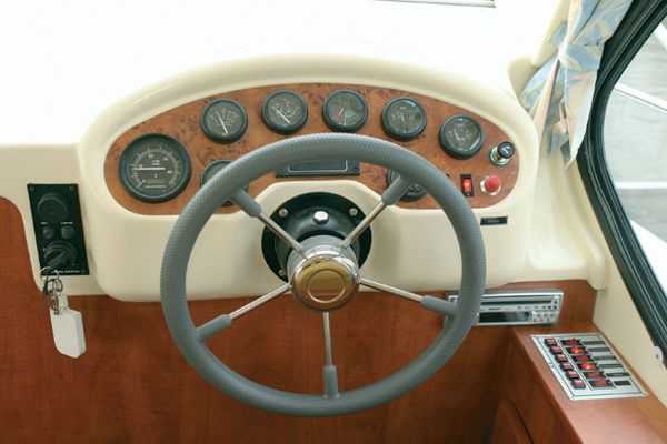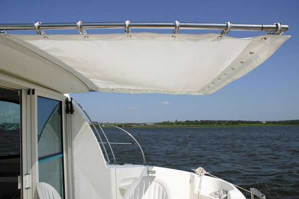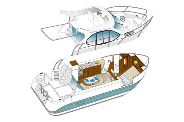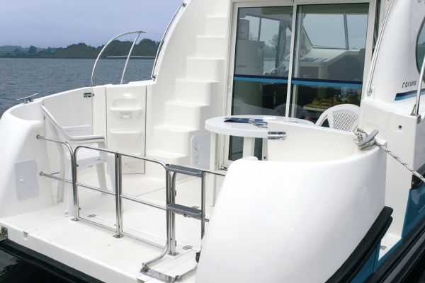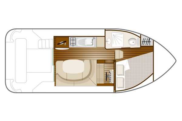 Neben einer geräumigen Doppelkabine und einer Nasszelle mit Waschbecken, Dusche und elektrischer Toilette besticht dieses Boot auch mit einer gut ausgerüsteten Küche, die für ein Boot von dieser kleinen Größe eine beachtliche Ausstattung aufweist: großer Kühlschrank (220 l inkl. Gefrierfach), 2 Flammen Herd und Backofen. Der helle Aufenthaltsraum bietet einen Panoramablick. Durch die Glasschiebetür erreicht man ebenerdig die hintere Terrasse mit Gartenmöbel und Sonnensegel. Das Boot besitzt ausserdem einen zweiten Steuerstand, eine Badeleiter und eine Aussendusche. Zum weiteren Komfort gehören ein Flachbildschirm + DVD, Radio/CD/MP3 sowie ein Kaianschluss 220 V.