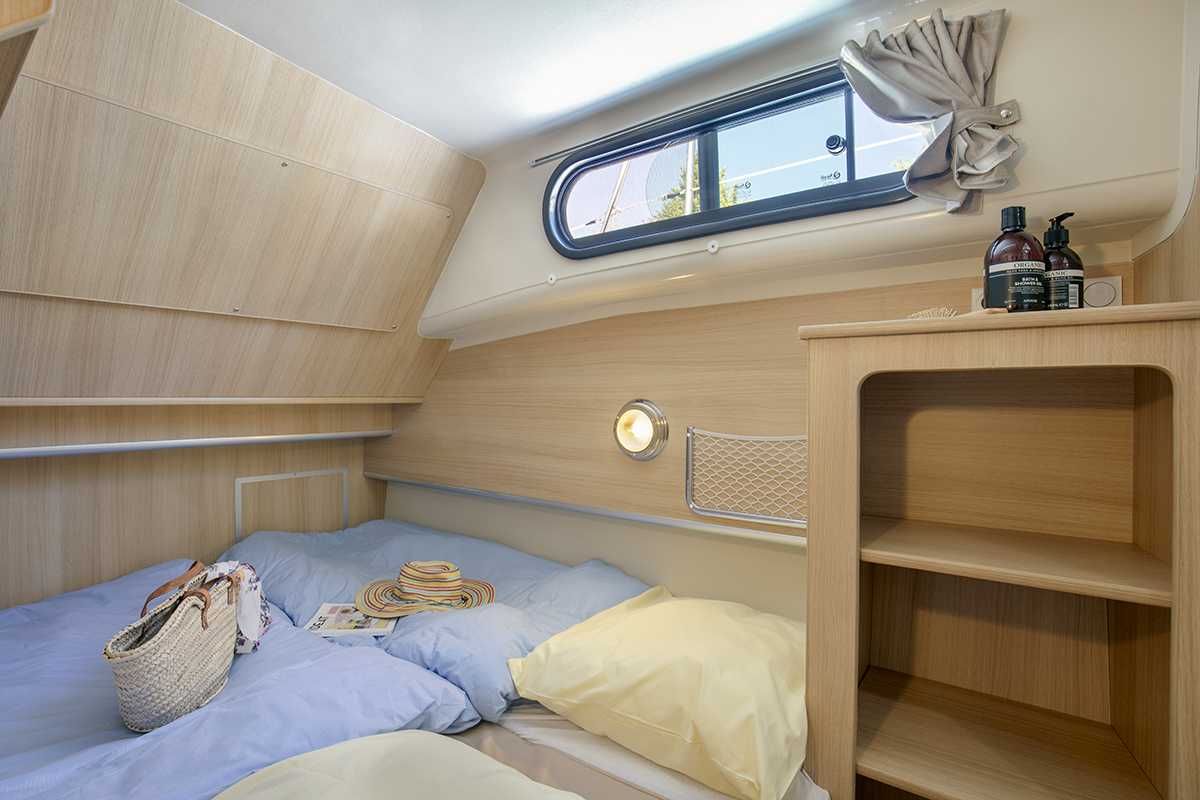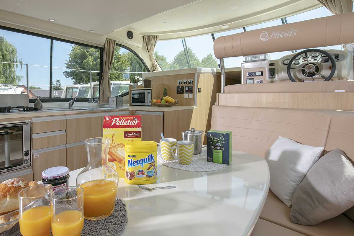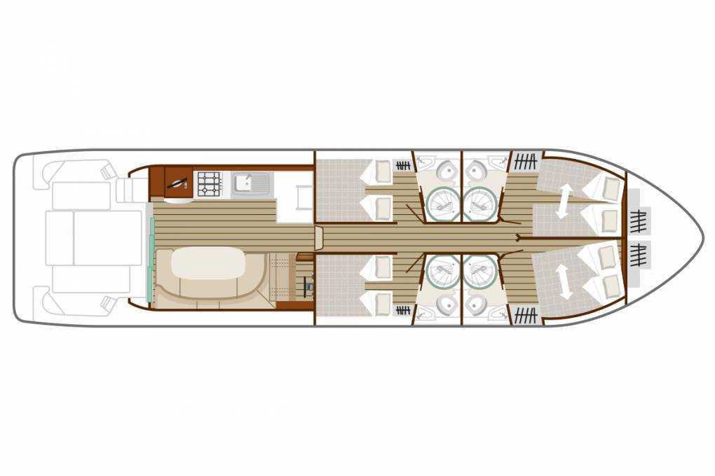 Die Octo Fly hat 4 Doppelkabinen und 4 Badezimmer inkl. Duschkabinen für höchsten Komfort. Die gut ausgestattete Küche hat einen grossen Kühlschrank (220 l inkl. Gefrierfach), einen 4 Flammen Herd, Backofen und Mikrowelle. Die überdachte Heckterrasse mit Gartenmöbeln bietet einen Zugang zum Oberdeck mit Essbereich und Aussenküche (Spülbecken, Plancha) im Schatten eines Biminis. Auf dem Oberdeck befindet sich auch der zweite Steuerstand sowie zwei Liegematratzen zum Entspannen. Als weitere Ausstattung verfügt die Octo Fly über einen Fernseher mit Satellitenantenne, Radio/CD/MP3, 220-V-Kaianschluss sowie ein Stromaggregat, um selbst unterwegs über 220 V zu verfügen. Eine Badeleiter und Aussendusche ergänzen den Komfort dieses Bootes.