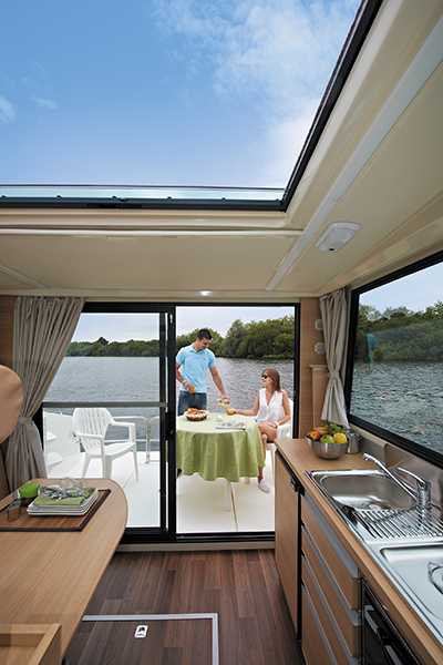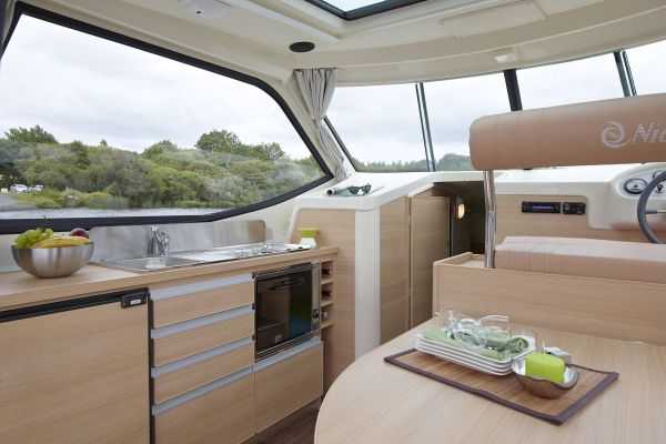 Sein Aufenthaltsraum ist geräumig und sehr hell, dank eines neuen gläsernen Schiebedaches. Die Kabine bietet ein Doppelbett, viel Stauraum sowie einen Direktzugang zur Nasszelle. Der Aufenthaltsraum mit der gut ausgestatteten Küche bietet einen Panoramablick und durch die Glasschiebetüre erreichen Sie ebenerdig die hintere Terrasse. Die Gartenmöbel können auf Anfrage kostenlos dazu gebucht werden. Zum weiteren Komfort dieses Bootes gehören ein Kaianschluss 220 V sowie eine Badeleiter. Ein tolles Boot für den ersten Urlaub dieser Art, zu einem kleinen Preis!