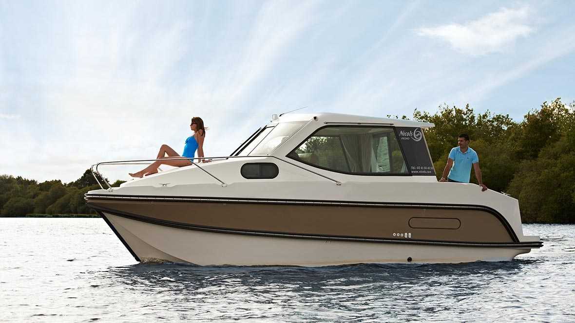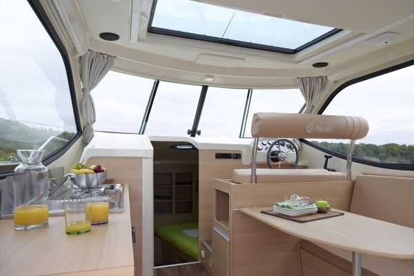 Das kleine Hausboot Nicols Primo ist ein einfaches aber auch elegantes Modell mit modernen Farben im Inneren ideal für ein Paar.