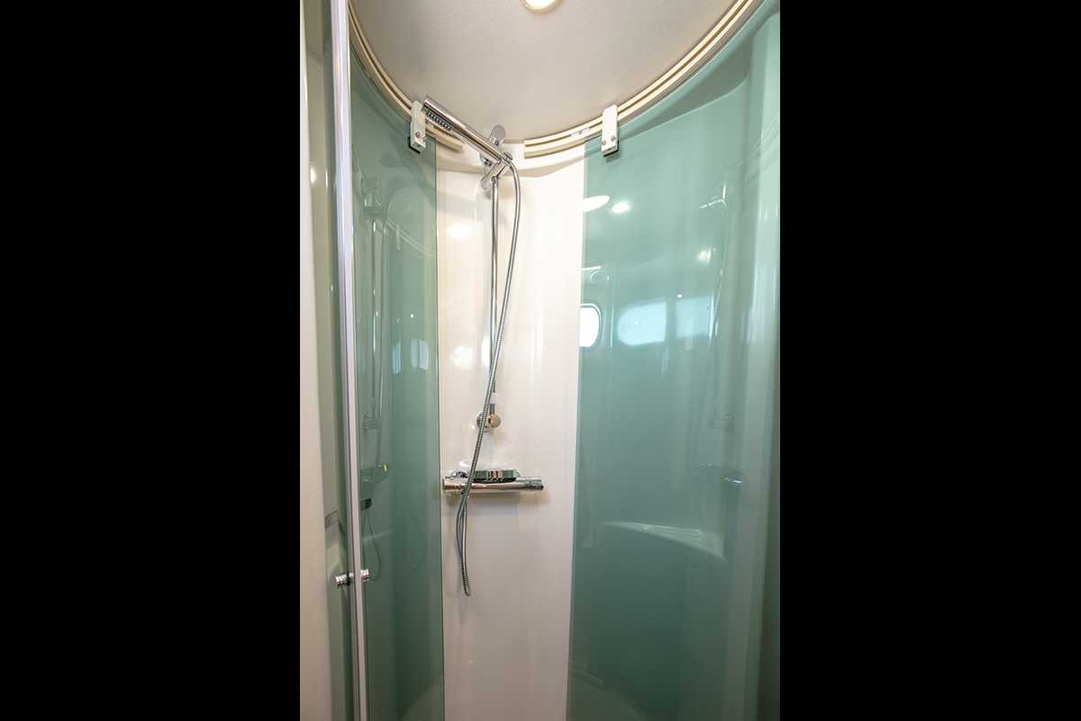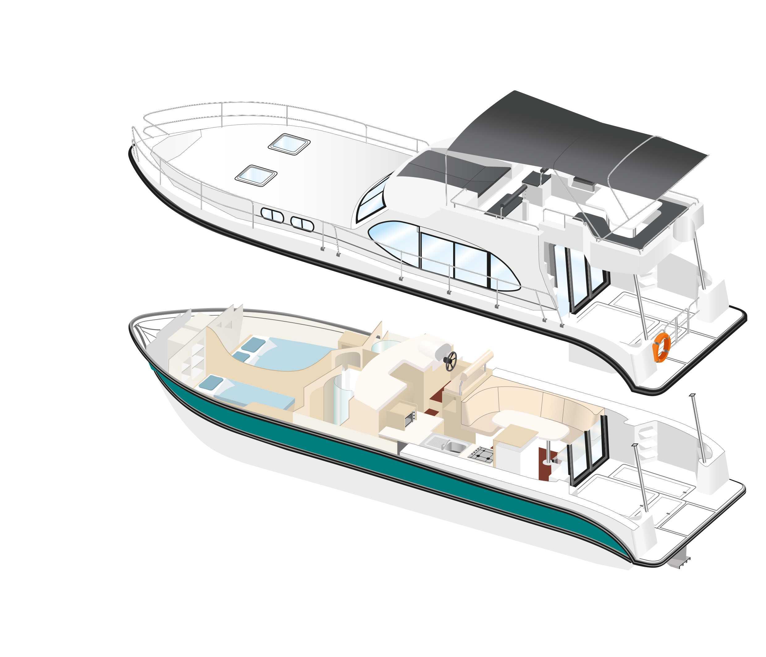 Die zwei Doppelkabinen im Bug des Bootes haben jeweils eine eigene Nasszelle mit sparater Duschkabine. Die Doppelbetten sind umbaubar zu zwei Einzelbetten. Der helle Aufenthaltsraum bietet einen Panoramablick. Die gut ausgestattete Küche beinhaltet einen grossen Kühlschrank (200 l inkl. Gefrierfach), einen 4 Flammen Herd, Backofen, Mikrowelle, Geschirrspülmaschine sowie eine Kaffeemaschine. Zum weiteren Komfort gehören die Klimaanlage ein Flachbildschirm mit Stalittenantenne + DVD, Radio/CD/MP3, ein Safe sowie ein Kaianschluss 220V. Am Heck befindet sich eine schöne gedeckte Terrasse mit Gartenmöbel und wie alle Boote der Fly-Serie hat auch dieses Boot eine Flying Bridge mit Essbereich, Aussenküche und Binimi. Dank des Bugstrahlruders ist die Nicols Quattro Fly C Green kinderleicht zu steuern und dank dem Elektroantrieb gleitet es beinahe geräuschlos durchs Wasser.