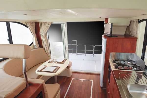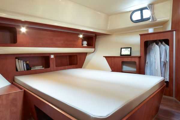 Die zweite Kabine ist kleiner und bietet ein Umbaubett, d. h. man kann daraus ein Doppel- oder 2 Einzelbetten machen. In der gut ausgestatteten Küche finden Sie einen großen Kühlschrank (220 l inkl. Gefrierfach), einen 4 Flammen Herd und Backofen. Der helle Aufenthaltsraum bietet einen Panoramablick. Durch die grosse Glasschiebetür erreicht man ebenerdig die schöne grosszügige hintere Terrasse mit Gartenmöbel und Sonnensegel. Das Boot besitzt ausserdem einen zweiten Steuerstand, eine Badeleiter und eine Aussendusche. Zum weiteren Komfort gehören ein Flachbildschirm + DVD, Radio/CD/MP3 sowie ein Kaianschluss 220 V.