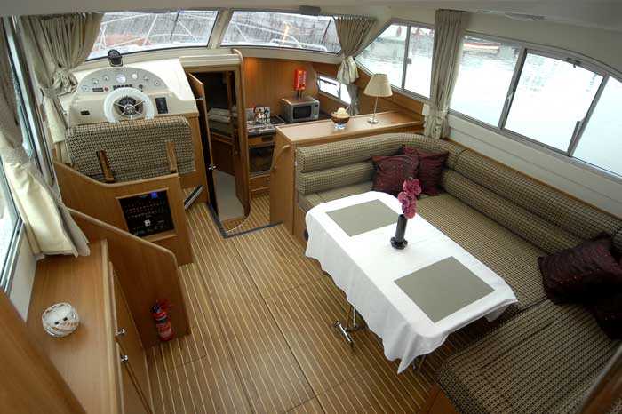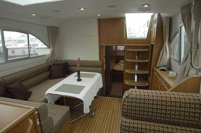 Ausstattung- Geräumier Aufenthaltsraum mit Esstisch und Sitzecke, umwandelbar in ein Doppelbett. Salon und Bordküche im Teakholzdekor, Fussboden aus Stechpalmenholz