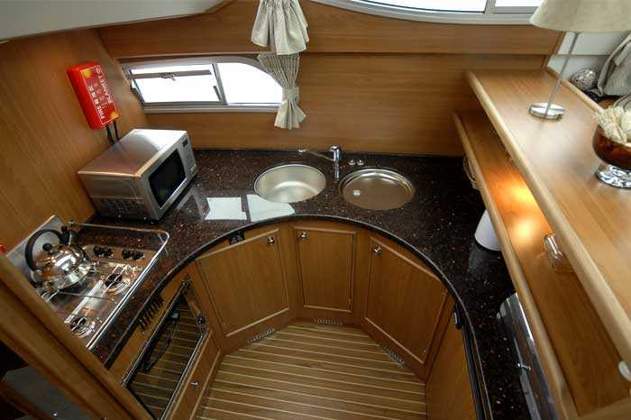 Dieses Boot wurde mit sehr schönen Materialien gefertigt, Gesellschaftsraum und Bordküche sind mit Teak verkleidet und der Boden ist aus Stechpalmenholz. Die gut eingerichtete, edle Küche wird durch eine Mikrowelle ergänzt. Die zweite Steuerung auf dem Oberdeck ist durch eine Windschutzscheibe geschützt und das geräumige Sonnendeck bietet angenehme Sitzgelegenheiten. Die erweiterte Badeplattform hat auch einen Fahrradständer und bietet einfachen Zugang zum Achterdeck durch integrierte Stufen. Ein GPS Navigationssystem mit Karten vom Shannon vereinfachen das Fahren.