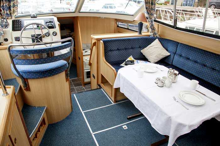 Der Aussensteuerstand kann mit einer PVC Überdachung (umklappbar) geschützt werden. Sie haben auf dem Aussendeck ausserdem einen bequemen Sitzbereich mit Tisch. Ein Plus dieses Bootes ist auch sein extra grosser Kühlschrank.