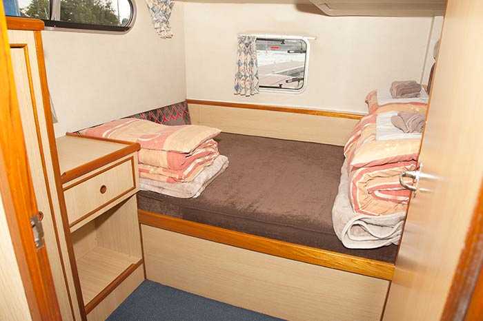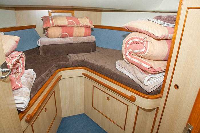 - Eine Heckkabine mit Doppelbett, eine Heckkabine mit zwei Etagenbetten