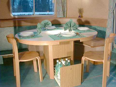 Ausstattung- Wohnküche mit Kochplatte (neuere Modelle) oder 3-flammigem Gasherd, Backofen, 220l-Kühlschrank (davon 40l Tiefkühler), Spülbecken, Schubladen und Stauraum. Esstisch mit Stühlen und Sitzbank, Kaminofen