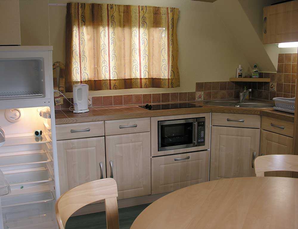 Ausstattung- Wohnküche mit Kochplatte, Backofen, grossem Kühlschrank, Spülbecken, Schubladen und Stauraum. Esstisch mit Stühlen und Sitzbank, Kaminofen