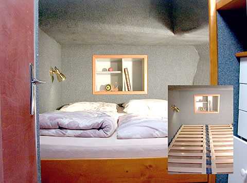 - Geräumige Bugkabine mit 2 Einzelbetten (Lättlirost, Bultex-Matratzen), umbaubar zu einem Doppelbett