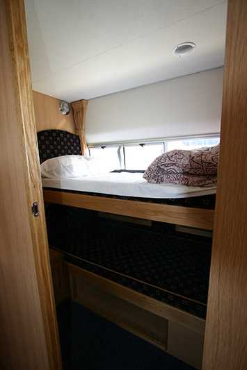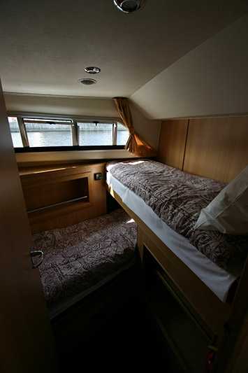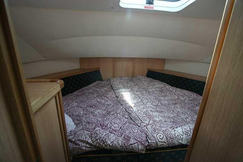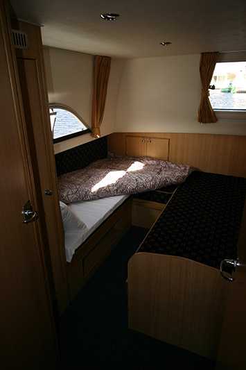 - Fünf getrennte Schlafkabinen: 2 Heckkabinen mit Doppelbetten, als zwei Einzelbetten benutzbar. Bugkabine mit V-Koje. WEitere Kabine im vorderen Teil mit 2 Etagenbetten, Seitenkabine mit zwei Etagenbetten.