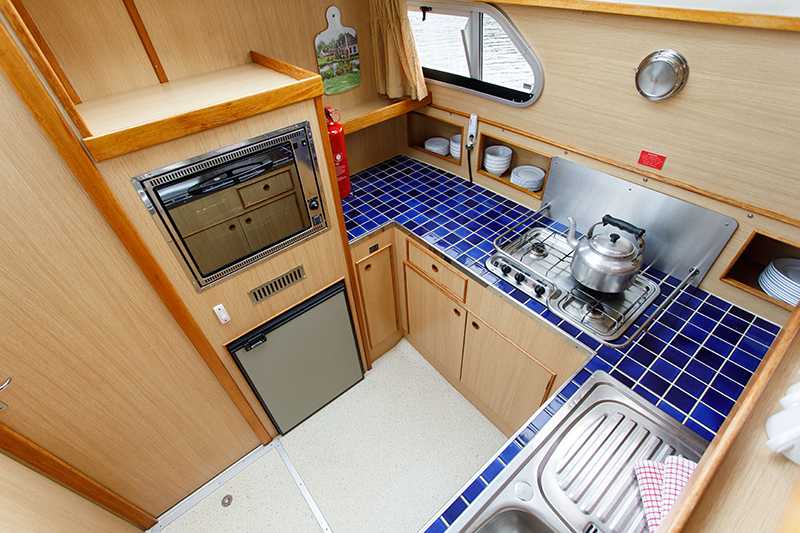 - Gut ausgestattete Kombüse mit grossem Kühlschrank, erhöhtem Backofen/Grill, Gasherd und Edelstahlspühle
