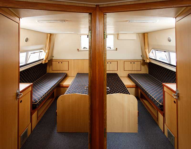 - 2 Heckkabinen, jeweils mit Doppelbett, umbaubar zu jeweils zwei Einzelbetten