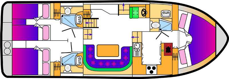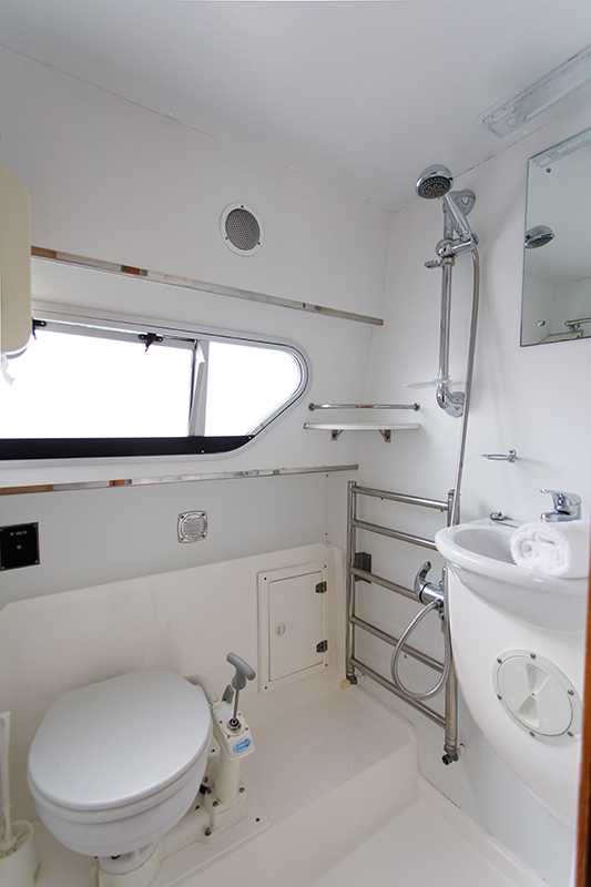 Es bietet guten Komfort für 3 Paare oder eine grössere Familie. Jede der 3 Kabinen hat eine eigene Nasszelle inkl. Handtuchheizkörper. Speziell für dieses Boot ist auch der beheizte Trockenschrank für nasse Kleidung im geräumigen Salon. Die Waterford verfügt ausserdem über ein grosses Sonnendeck mit Sitzgelegenheiten rundherum sowie einem zweiten Steuerstand auf der Flybridge.