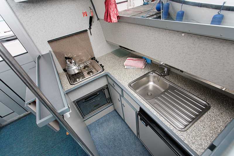 - Kombüse mit 4-Flammen-Gasherd, Backofen/Grill und Kühlschrank